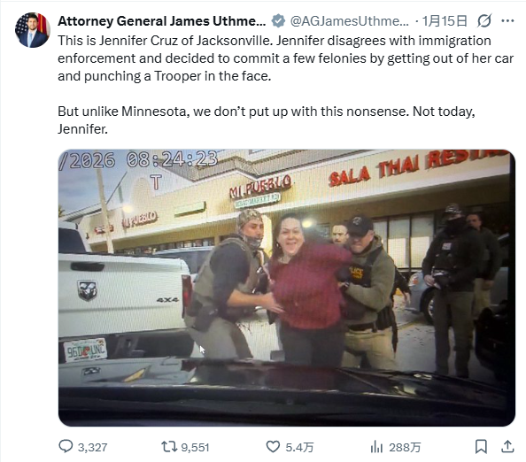 乌斯迈尔在X帖文中贴出克鲁兹被两名特工制服的照片,她面带笑容,似乎对逮捕毫不在意。他写道:“这是杰克逊维尔的詹妮弗·克鲁兹。她不同意移民执法,于是下车打了巡警一拳,犯下几项重罪。但和明尼苏达州不同,我们不会容忍这种胡闹。今天不行,詹妮弗。”